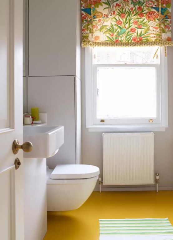 誰說拼色只是為了時尚?在這個小衣帽間里也很有效。簡潔是關(guān)鍵,引人注目的黃色地板從白色背景和浴室套房中突顯出來