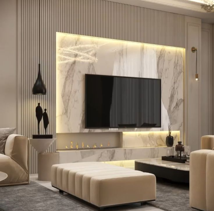 使用大理石飾面墻可以實現另一種豪華的流行電視墻單元設計。墻壁的其余部分保持非常簡單,以實現完整的 la 模式設計。中性和柔和的顏色最適合這種設計。背光室內燈有助于保持這種設計的華麗氛圍。簡單的懸掛式吊燈非常適合走廊的其他部分。